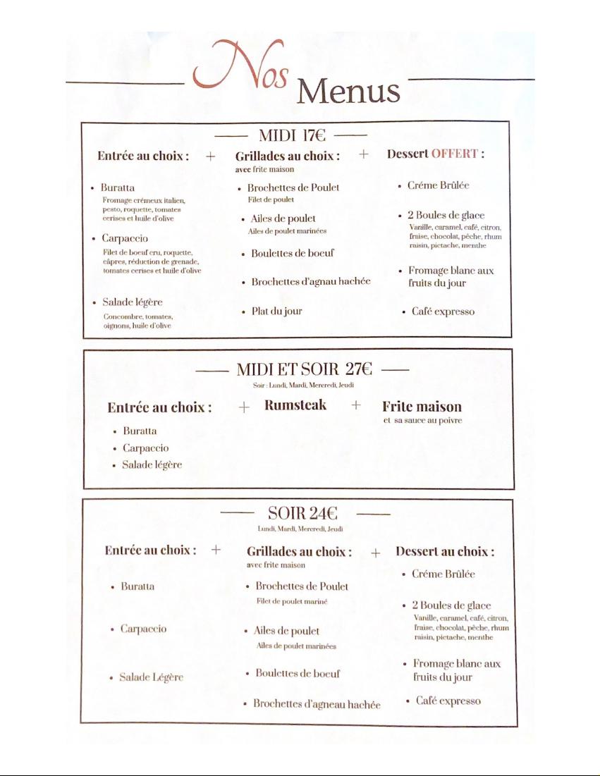 - Lunch Menu: Perfect for midday cravings, enjoy a choice of entrée, grilled specialties, and a complimentary dessert for just €17.