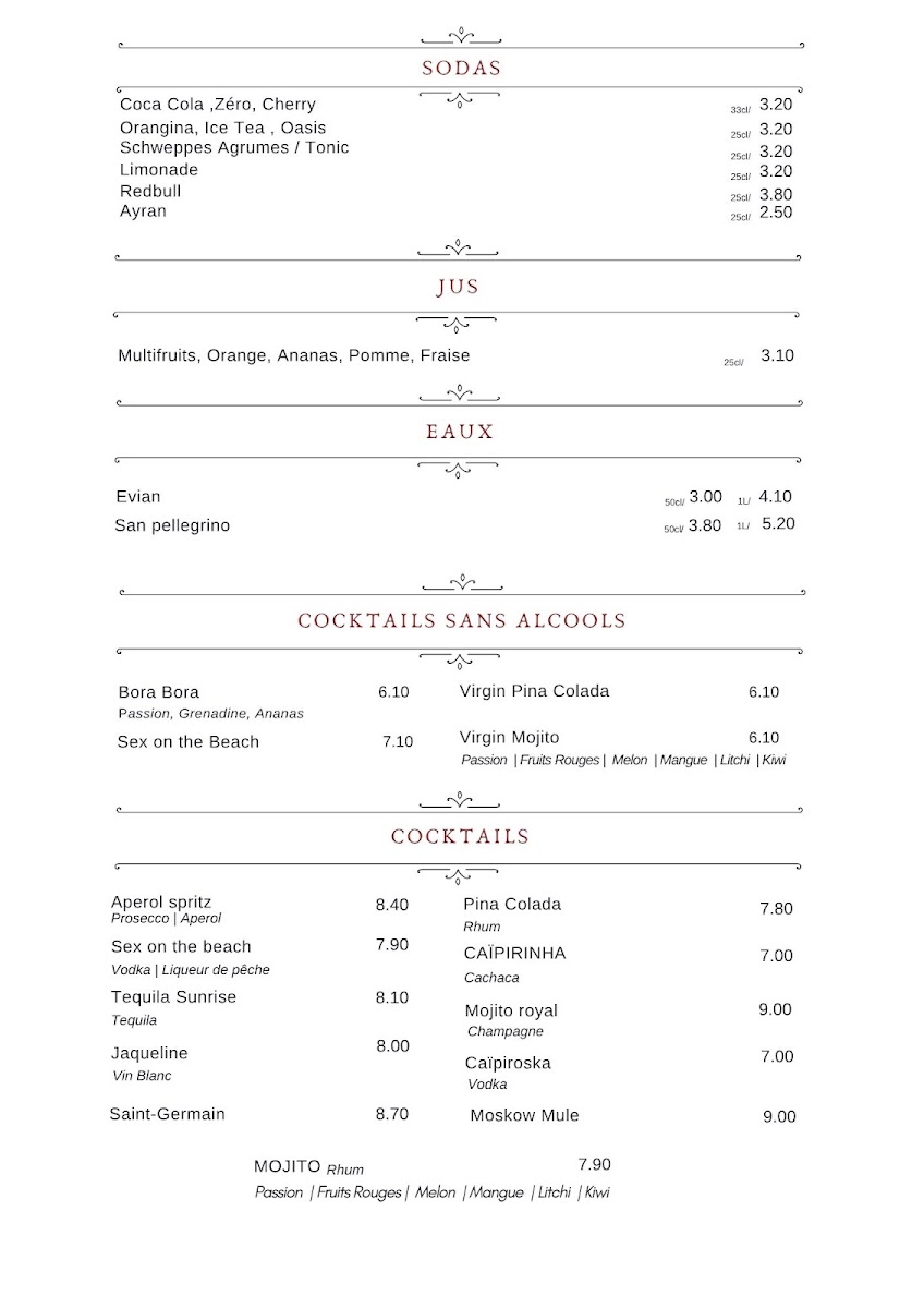 Boules de glace: 1 boule 2.50€, 2 boules 4.00€, 3 boules 5.60€, 4 boules 6.20€, 5 boules 7.40€ ( Chocolat - Vanille - Caramel - Café - Pêche - Fraise - Menthe - Citron - Rhum raisin - Pistache )